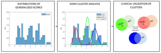 This procedure shown in Figure 2 returns a metric of reliability of the new generalized score in the diagnostic domain since the NMI value indicates the level of agreement between the clusters identified in an unsupervised manner by using only the score and the corresponding diagnostic labels of the subjects belonging to each cluster. We also performed a permutation test to assess the statistical significance of the overlap between the identified clusters and the clinical groups. In detail, a null distribution was generated by randomizing group labels 10,000 times and by calculating the NMI value between the GMM clusters and the permuted labels at each permutation. Finally, a p value was assigned as the number of times that the permuted overlap was greater than the actual NMI values, divided by the number of permutations. We used the MATLAB GMM implementation provided by the Statistics and Machine Learning Toolbox (https://it.mathworks.com/products/statistics.html).