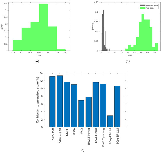 (a) Empirical probability distribution of the variance explained by the first component of the ten indices. (b) Empirical probability distributions of NMI values for the actual labels and permuted labels. (c) Contribution of each clinical index to the explained variance of the generalized score averaged across the validation rounds.