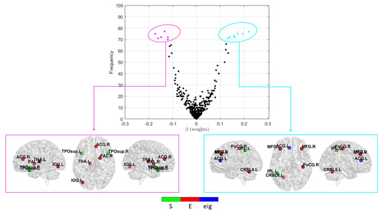 As can be noticed in Figure 5, a strong correlation exists between stability, i.e., greater frequency of occurrence in different validation rounds, and average weights of features resulting from the Lasso models. In particular, the most stable features (i.e., those with an occurrence greater than 70%) for both negative and positive association with the generalized cognitive score are shown in the bottom part of Figure 5. In Table 3, the same regions with their MNI coordinates are also specified. It is worth noting that, for both positive and negative associations, the nodal efficiency of the regions prevails over the other two graph metrics.
