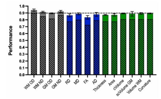 Classification performances of all classifiers. Each bar represents the performance (solid-colored bar: average F-score, shaded area: average accuracy) of each type of classifier trained on one imaging measure, data is presented as mean ± SEM after cross-validation. Grey-colored bars: NDI measure-based classifiers. Blue-colored bars: diffusion tension imaging (DTI) measure-based classifiers. Green-colored bars: T1-weighted structural MRI (T1W-MRI) measure-based classifiers. WM OD = white matter orientation dispersion, WM ND = white matter neurite density, GM OD = grey matter orientation dispersion, GM ND = grey matter neurite density, RD = radial diffusivity, MD = mean diffusivity, FA = fractional anisotropy, AD = axial diffusivity, thickness = cortical thickness, area = cortical surface area, cVolume = cortical volume, scVolume = subcortical GM volume, volume WM = white matter volume.