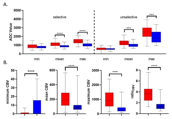 Box plot analysis of ADC and CBV measurement in GBM and PCNSL patients. (A) Box plot of apparent diffusion coefficient analysis of selective and unselective minimum, mean and maximum ROI measurement in patients with GBM (red) and PCNSL (blue). (B) Box plot of DSC CBV imaging analysis in patients with GBM (red) and PCNSL (blue). p values less than 0.05 were considered statistically significant. *** p < 0.001, **** p < 0.0001.
