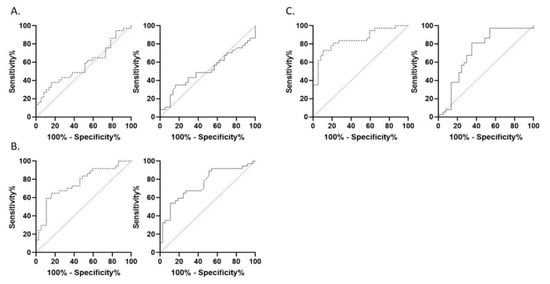 Receiver-operating-characteristics (ROC) analysis of ADC measurements for differentiation of GBM and PCNSL. ROC analysis of apparent diffusion coefficient of selective (dotted line) and unselective (solid line) ROI measurement for differentiation of patients with GBM and PCNSL by minimum ADC (A), mean ADC (B) and maximum ADC (C) values.