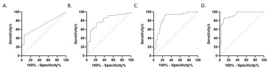 Minimum and mean CBV measurements of the contrast enhancing lesions and maximum CBV measurements of PCNSL showed no Gaussian distribution (pCBV min PCNSL = 0.0001; pCBV min GBM < 0.0001; pCBV mean PCNSL < 0.0001; pCBV mean GBM = 0.009; pCBV max PCNSL < 0.0001), mean CBV measurements of the contralateral healthy white matter and maximum CBV measurements of GBM showed a Gaussian distribution (pCBV contra PCNSL = 0.058; pCBV contra GBM = 0.16; pCBV max GBM = 0.25). Minimum, maximum and mean CBV values showed a significant difference in GBM patients compared to PCNSL patients (CBVmin GBM = 1.32 ± 5.5, CBVmin PCNSL = 15.7 ± 24.6, pCBV min < 0.0001; CBVmax GBM = 1013 ± 622, CBVmax PCNSL = 353 ± 289, pCBV max < 0.0001; CBVmean GBM = 211.5 ± 133; CBVmean PCNSL = 104 ± 87; pCBV mean < 0.0001). CBV ratio showed a significant difference in GBM patients compared to PCNSL patients (ratioGBM = 3.76 ± 1.6; ratioPCNSL = 1.39 ± 0.8; pratio < 0.001; Figure 2B). The AUC value for minimum CBV measurements was 0.703, for maximum CBV 0.857, for mean CBV 0.804, for CBVratio 0.930; see also Figure 4A–D. The optimal cut-off values to differentiate GBM from PCNSL were determined (CBVmin = 4.5; CBVmax = 473; CBVmean = 129.5; ratioCBV = 2.2). This corresponded to the histological diagnosis in 43% of PCNSL patients (16 of 37) and 95% of GBM patients (35 of 37) for CBVmin, in 78% of PCNSL patients (29 of 37) and 78% of GBM patients (29 of 37) for CBVmax, in 78% of PCNSL patients (29 of 37) and 73% of GBM patients (27 of 37) for CBVmean and in 89% of PCNSL patients (33 of 37) and 84% of GBM patients (31 of 37) for ratioCBV.