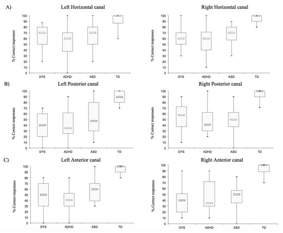Boxplot with median and inter-quartile range of corrected answer of the Landolt C optotypes in the left- and rightward direction for each vestibular canal (A): horizontal, (B): posterior, and (C): anterior) for each child tested. DYS, children with dyslexia; ADHD, children with attention deficit hyperactivity disorder; ASD, children with autism spectrum disorders; TD, children with typical development.