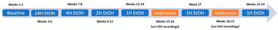 USV recordings were conducted at the beginning of the dark cycle as described in previous studies [36]. All rats were recorded under both alcohol-naïve and alcohol-available (or water-available for control rats) conditions. Following the habituation period, USVs were recorded for 4 h and 10 min per day, 3 days/week over a 24-week experimental timeline (Figure 1). CM16 microphones were used with an UltraSound Gate interface (Avisoft Bioacoustics, Berlin, Germany) to record USVs at a 250-kHz sampling rate and a 16-bit resolution. On recording days, animals were weighed at the beginning of the dark cycle, transported to a test room, and placed into recording cages (which were identical to their home cage but only used for USV recordings). Recordings began immediately after the animals were placed in their respective cages. Following a 10-min “anticipatory” period, EtOH (or water) and food were introduced to the recording cages and USVs were recorded continuously for the next 4 h. Each animal was assigned its own recording cage in order to prevent any non-specific behaviors related to novelty or conspecific scents [39]. Based on rat and chamber size, we approximate the distance between the animal’s head and the centered microphone to range from 5 cm to 28.4 cm. After the recording session, the animals were transported back to the vivarium and returned to their home cage.