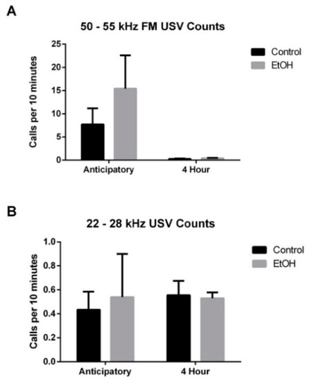 Finally, we used linear mixed models to assess the effect of EtOH treatment on the counts and acoustic characteristics of spontaneously emitted 50–55 kHz FM and 22–28 kHz USVs. The calls emitted during the anticipatory period were analyzed separately from those emitted during the 4-h recording session in the presence of water or EtOH.