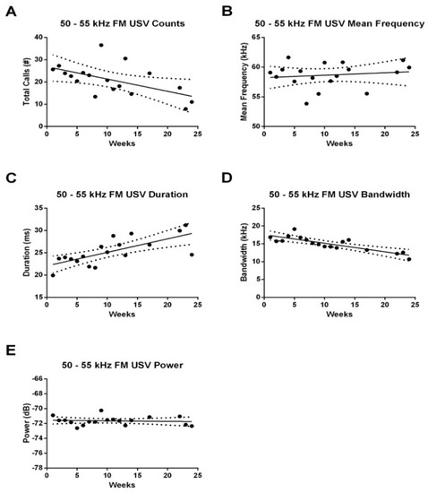 Correlation between age and 50–55 kHz FM USV counts and acoustic characteristics during the 4-h recording period. (A) There was a significant reduction in total 50–55 kHz FM USV counts as the animals aged (p < 0.05). (B) Mean frequency of 50–55 kHz FM USVs did not vary with age. There was an increase in (C) duration, and decrease in (D) bandwidth with age. (E) Power did not vary with age. Dots represent the group average across all control rats during each of the recording weeks.