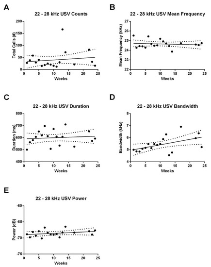 Correlation between age and 22–28 kHz USV counts and acoustic characteristics during the 4-h recording period. (A) There was no change in total 22–28 kHz USV counts as the animals aged. (B) Mean frequency or (C) duration of 22–28 kHz USVs did not vary with age. (D) There was an increase in bandwidth with age. (E) Power of these calls did not vary with age. Dots represent the group average across all control rats during each of the recording weeks.