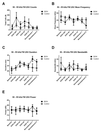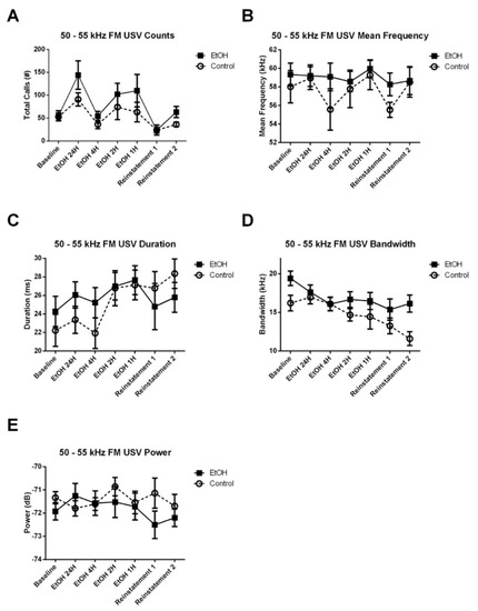 Effect of EtOH exposure on counts and acoustic characteristics of 50–55 kHz FM USVs emitted during the 4-h session. (A) There was no Treatment × Experiment Stage interaction, nor any main effect of Table 50–55 kHz FM calls. (B) There was a significant Treatment × Experiment Stage interaction for mean frequency (p < 0.05) of these calls. (C) There was no Treatment × Experiment Stage interaction, nor any main effect of treatment on duration. There was a significant Treatment × Experiment Stage interaction for (D) bandwidth (p < 0.05), and (E) power (p < 0.05) of these calls.