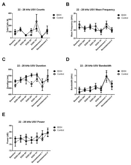 We did not observe any significant Treatment × Experiment Stage interaction, nor any main effect of treatment on the number or the acoustic characteristics of 22–28 kHz USVs emitted during the anticipatory period. Although it is important to note that the lack of any effects is not particularly surprising due to the short duration of the anticipatory period resulting in very few total 22–28 kHz calls per animal (Control: 20.37 ± 7.09; EtOH: 25.37 ± 16.86) over the course of the experiment.