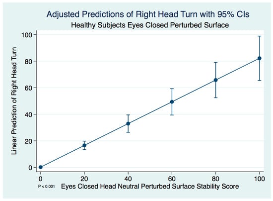 A linear regression model predicting the stability score of a healthy control subject with a right head turn by the head neutral position was statistically significant (F(1, 58) = 82.68, [95% CI 0.6372409–0.9970173], p ≤ 0.001). We expect an increase of 0.82 units in the stability score of a right head turn for every increase of 1 unit of stability in the head neutral position. There are extremely strong substantive significant effect sizes (R2 = 0.587, η2 = 0.588). The adjusted predictions of right head turn stability scores with 95% CIs are demonstrated in Figure 2.