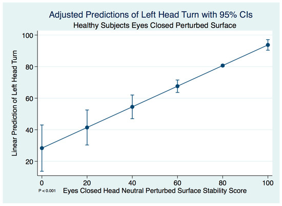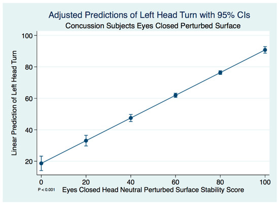 Again, we found significant differences in the concussion subjects with a left head turn compared to the head neutral position on a perturbed surface with the eyes closed, this time using a paired t-test (t (574) = 2.2536, p = 0.025). A linear regression model predicting the stability score of a concussion subject with a left head turn by the head neutral position was statistically significant (F(1, 573) = 525.19, [95% CI 0.6594581–0.7830927], p ≤ 0.001). We expect an increase of 0.72 units in the stability score of a left head turn for every increase of 1 unit of stability in the head neutral position. There are extremely strong substantive significant effect sizes (R2 = 0.478, η2 = 0.478. The adjusted predictions of left head turn stability scores for the concussion subjects with 95% CIs are demonstrated in Figure 3.