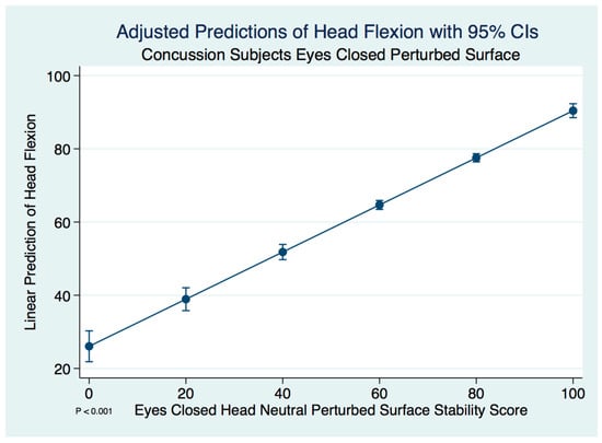 We did not find a significant difference in the stability scores in the concussion subjects when the head was flexed forward compared to the head neutral position on a perturbed surface with the eyes closed using a paired t-test (t (574) = −0.8276, p = 0.4082). A linear regression model predicting the stability score of a concussion subject with head flexion by the head neutral position was statistically significant (F(1, 573) = 492.29, [95% CI 0.5865769–0.7005139], p ≤ 0.001). We expect an increase of 0.64 units in the stability score with head flexion for every increase of 1 unit of stability in the head neutral position. There are extremely strong substantive significant effect sizes (R2 = 0.462, η2 = 0.462). The adjusted predictions of head flexion stability scores for the concussion subjects with 95% CIs are demonstrated in Figure 5.