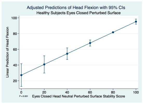 Unlike the concussion subjects, we did find significant differences between the head neutral and head flexed postures in healthy control subjects using a paired t-test (t (59) = −3.247, p = 0.002). A linear regression model predicting the stability score of a healthy control subject with head flexed by the head neutral position was statistically significant (F(1, 58) = 59.23, [95% CI 0.5035146–0.8574998], p ≤ 0.001). We expect an increase of 0.68 units in the stability score of head flexed for every increase of 1 unit of stability in the head neutral position. There are extremely strong substantive significant effect sizes (R2 = 0.505, η2 = 0.505). The adjusted predictions of head flexion stability scores in healthy controls with 95% CIs are demonstrated in Figure 6.