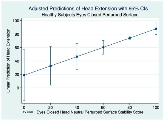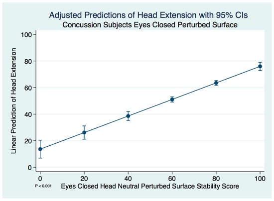 By far the greatest differences in posture with head movement were seen with extension of the head. We found a significant difference in the stability scores in the concussion subjects when the head was extended compared to the head neutral position on a perturbed surface with the eyes closed using a paired t-test (t (574) = 15.1967, p = 0.0000). A linear regression model predicting the stability score of a concussion subject with head extension by the head neutral position was statistically significant (F(1, 573) = 178.78, [95% CI 0.5315742–0.7146363], p ≤ 0.001). We expect an increase of 0.62 units in the stability score with head extension for every increase of 1 unit of stability in the head neutral position. There are extremely strong substantive significant effect sizes (R2 = 0.238, η2 = 0.238). The adjusted predictions of head extension stability scores for the concussion subjects with 95% CIs are demonstrated in Figure 7.