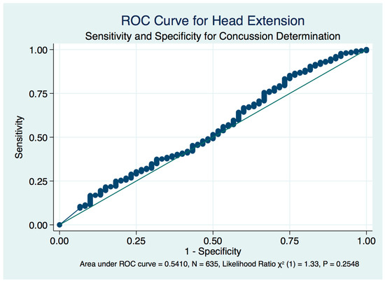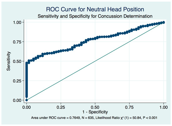 We plotted receiver operating characteristic curves (ROC) of the true positively identified concussion cases against the false positive rate of concussion identification by the stability scores induced by head position. The standardized neutral head position in the mCTSIB provides only a fair but significant diagnostic biomarker of concussion (area under the curve (AUC) = 0.7649, LR χ2 (1) = 50.84, p < 0.001) (Figure 9), whereas both right (AUC = 0.8119, LR χ2 (1) = 71.90, p < 0.001) (Figure 10) and left (AUC = 0.8057, LR χ2 (1) = 61.67, p < 0.001) (Figure 11) head turns provided good accuracy and statistically significant diagnostic biomarkers for concussion. Although head extension decreases the stability score of both healthy controls and concussion subjects with statistical significance compared to the neutral head position, it is non-significant and fails as a diagnostic test that might be used as a biomarker to identify a concussion (Figure 12).