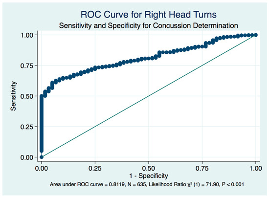 ROC curve for right head turn, eyes closed perturbed testing in concussion determination.