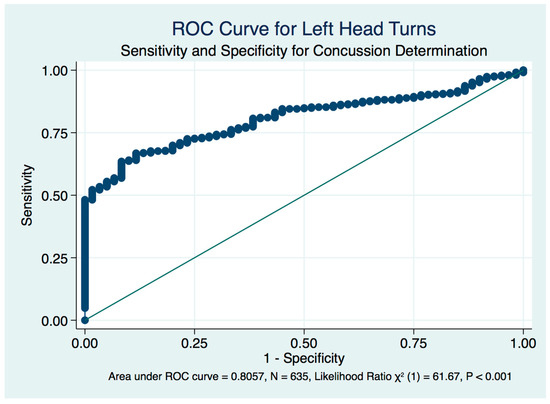 ROC curve for left head turn, eyes closed perturbed testing in concussion determination.