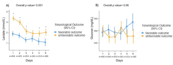 - Van Donkelaar, C.E.; Dijkland, S.A.; van den Bergh, W.M.; Bakker, J.; Dippel, D.W.; Nijsten, M.W.; van der Jagt, M. Early circulating lactate and glucose levels after aneurysmal subarachnoid hemorrhage correlate with poor outcome and delayed cerebral ischemia: A two-center cohort study. Crit. Care Med. 2016, 44, 966–972. [Google Scholar] [CrossRef]