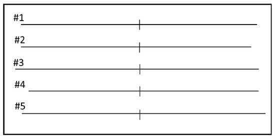 The visual stimuli and their presentation method were based on a previous study [34]. 1 mm thick, 145 to 155 mm long horizontal lines transected by a 1 mm thick, 10 mm long vertical line was presented on the center of the monitor (12-inch FHD (1920 × 1080 dots), Refresh rate of 59 Hz). At each trial, one of five lines was presented, differing in the position of the vertical transector (at midpoint, rightward, or leftward) and in the overall length of the line and of its right and left segments (Figure 1).