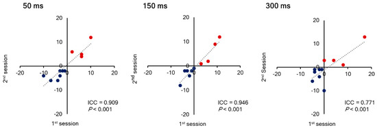 Seven out of 11 subjects (4 males and 3 females) consistently underestimated the length of the right-side segment (judging lines to be exactly pre-bisected when the vertical transector was located to the left of the midpoint, or judging left-side segment to be longer when the vertical transector was located at the midpoint) (Leftward bias). In contrast, the remaining four subjects (2 males and 2 females) showed rightward bias. Inter-trial reproducibility of the score in a line length judgement task was ICC (2,1) = 0.909 for a stimulus presentation time of 50 ms, 0.946 for 150 ms, and 0.771 for 300 ms (p < 0.01) (Figure 2). The highest reproducibility was demonstrated with a stimulus presentation time of 150 ms. There was no significant effect of stimulus presentation time or session order on the score (Figure 3). The tendency of a leftward or rightward bias was consistent across a stimulus presentation times and sessions.