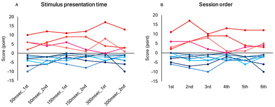 Individual scores of line length judgement task compared between (A) stimulus presentation times and (B) for session order (between 6 preliminary sessions). The red lines indicate a rightward bias, and the blue lines indicate a leftward bias.