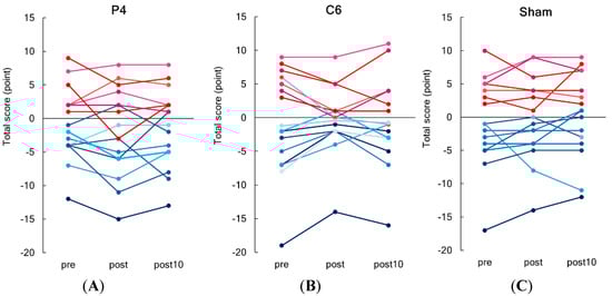 Serial changes in the individual total scores of line length judgement task before (pre), immediately after (post), and 10 min (post 10) after transcranial static magnetic stimulation (tSMS) for 20 min. Scatter plots present the individual values for each stimulation condition: (A) P4, (B) C6 and (C) sham stimulation. Nine subjects showed a rightward bias (reddish lines), and seven subjects showed a leftward bias (blueish lines).