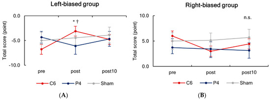 Serial changes in the total scores of line length judgement task before (pre), immediately after (post), and 10 min (post 10) after tSMS for 20 min, separately presented for the left-biased group (A) and right-biased group (B). In the left-biased group, the magnitude of bias was significantly reduced immediately after tSMS over C6, and the bias was significantly smaller for C6 as compared to P4 at post. * p < 0.001 vs. pre, † p < 0.05 vs. tSMS over P4.