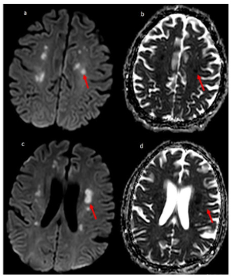 51-year-old man COVID-19 RT-PCR positive presented with dysarthria and change in mentation. MR Diffusion image (a) showing multiple foci of restricted diffusion (red arrow) involving centrum semiovale with the corresponding hypointense signal on ADC image (b), suggestive of embolic infarcts. (c) Showing multiple small foci of restricted diffusion (red arrow) involving centrum semiovale and periventricular white matter with the corresponding hypointense signal on ADC image (d), suggestive of embolic infarcts.