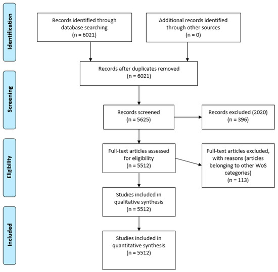 - Recognition: this process encompassed several actions: (1) the keywords of the reported WoS documents were analyzed (n = 9088); (2) co-occurrence node maps were designed; (3) a standardized network of co-words was created; (4) the keywords with the greatest significance were located (n = 8749); and (5) the most determining themes and constructs were established with a clustering algorithm