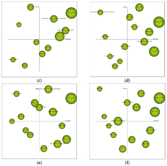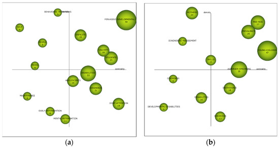 - Reproduction: various thematic networks and strategic diagrams made up of four regions were designed (upper right = motor and relevant themes; upper left = deeply rooted and isolated themes; lower left = disappearing or projected themes; and lower right = issues of poor development and transverse). All of these followed the principles of centrality and density