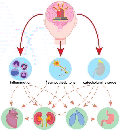 Acute brain injuries pose a great threat to global health as stroke stands out as the second most common cause of death overall, while traumatic brain injury is the leading cause of death and disability before age of 45 [,]. Cerebrovascular injury and brain trauma may differ in the origin of the primary damage, but the pathophysiological cascade that follows both of those conditions is similar, as the main consequences of the brain insult are: cerebral oedema, intracranial hypertension and cerebral vasospasm []. Patient with acute brain injury may develop distant organ failure even if no systemic diseases or infection are present (Figure 1). However, pathophysiological rationale suggests that in patients with prior organ insufficiencies, e.g., chronic kidney disease, chronic obstructive pulmonary disease and chronic heart disease, where biological reserves of such organs are reduced, any insult regarding central nervous system (CNS) could augment already present disease and worsen the course of its failure. Nevertheless, the severity of non-neurologic organs’ dysfunction depends on the extremity of brain injury. Additionally, dysfunction of non-neurologic organs can even further harm CNS. Therefore, the systemic manifestations of acute brain injuries impact mortality and disability. In this comprehensive review we sought to describe the organ-related consequences of acute brain injuries.