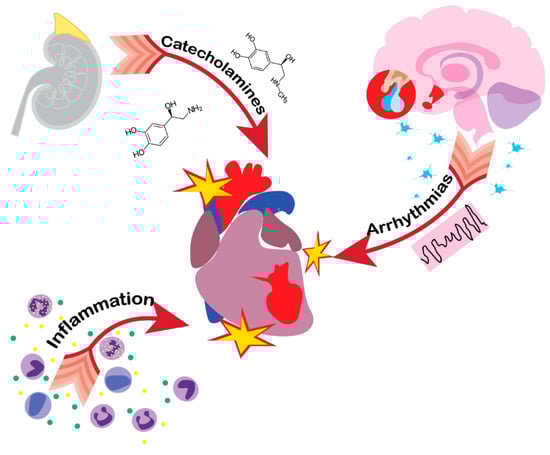 The norepinephrine-induced toxic effect appeared to be the result of cyclic AMP-mediated calcium overload of the cell and a decrease in cardiocyte’s viability []. The end result of this is mitochondrial dysfunction and cell death at myocardium. Moreover, catecholamines may lead to structural changes in cardiomyocytes known as “contraction band necrosis”, which are characterized by focal myocytolysis, myofibrillar degeneration, and irregular cross-band formation. Not only serum and cerebrospinal fluid (CSF) catecholamines but also sympathetic and parasympathetic impulsation serve a role in myocardial damage [,]. Reduction in cerebral blood flow (CBF) provokes autonomic response of vasomotor centre. Initially the activation of sympathetic centre increases norepinephrine release at nerve terminals, which is presented by rise in mean arterial pressure (MAP), heart rate and cardiac output. At this point, carotid baroreceptors are activated in response to high MAP and thus bradycardia of Cushing triad occurs []. The autonomic imbalance caused by central nervous system (CNS) dysfunction may lead to myocardial damage and dangerous arrhythmias, such as prolongation of the corrected QT (QTc), T-wave inversions and ST segment changes [,,]. The effect on the heart is dependent on the location of the ischemic lesion. It has been noticed that incidents localized in the insular region of the brain are associated with adverse cardiac outcomes [,]. It seems that right insular lesions result in sympathetic overactivity and thus associate with higher mortality than other sites [,]. The life-threatening arrhythmias after acute brain injury may also be caused by hypothalamic-pituitary-adrenal (HPA) axis dysfunction [,]. Finally, distant organ damage, including the heart, may be caused by systemic inflammatory responses that follows acute brain injury [,].