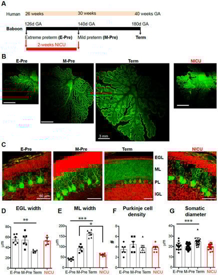 Preterm birth is prevalent even in developed countries, as nearly 10% of infants were born preterm in the US in 2017 []. After pre-term birth, infants continue their development in the highly stimulatory environment of the neonatal intensive care unit (NICU), rather than protected in the womb. Although survival of preterm infants has increased due to improved treatment in the NICU, preterm birth still results in deficits in neurodevelopment, leading to long-term disabilities. The cerebellum is a brain region that is severely impacted by preterm birth, likely due to its development late in gestation, when preterm birth occurs []. Individuals born prematurely have been shown a reduction in cerebellar size associated with hemorrhage [], infarction [], or, commonly, underdevelopment [,,]. Reduced cerebellar size caused by preterm birth can lead to cognitive, neuropsychological, and motor function deficits [,] and can persist into adulthood [].