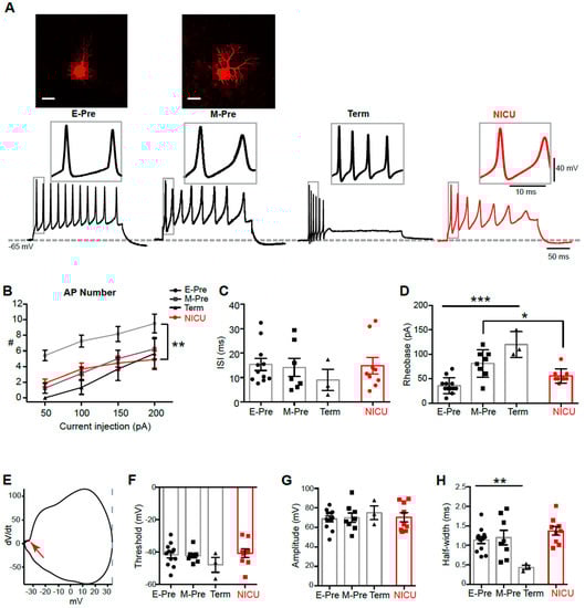 3.3. NICU Experience Influences the Late-Gestation Refinement of Intrinsic Electrophysiological Properties of Purkinje Cells