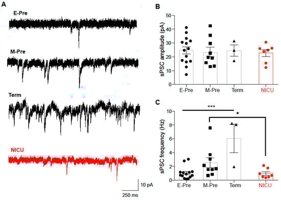 Spontaneous postsynaptic currents (sPSCs) increase in frequency throughout gestation and are reduced after NICU experience. (A) Representative traces of sPSCs recorded from Purkinje cells of E-Pre, M-Pre, Term, and NICU neonates. (B, C) Summary of sPSC amplitude (B) and frequency (C) at each group. Data are represented as ± SEM. * and *** represent p < 0.05, and p < 0.001, respectively.