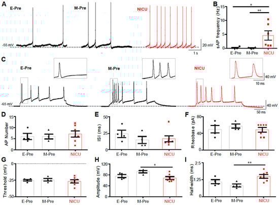 Purkinje cells are the sole output of the cerebellar cortex, integrating all signals within the cerebellar cortex and relaying the information to the DCN. Alterations in spiking properties and synaptic inputs to Purkinje cells in NICU-experienced neonates can therefore impact DCN neuronal activity [,]. To examine how pre-term birth followed by NICU experience impacts downstream signaling in the cerebellar circuitry, we recorded cells of the DCN using whole-cell patch clamp electrophysiology. DCN neurons in E-Pre, NICU, and M-Pre baboon neonates displayed spontaneous AP firing (Figure 4a). While frequency of spontaneous AP firing was not changed between E-Pre and M-Pre neonates, it was significantly increased in NICU (n = 4 cells from 3 E-Pre animals, 6 cells from 3 NICU animals, and 4 cells from 3 M-Pre animals; p = 0.0426, one-way ANOVA, Tukey post hoc; Figure 4b). The frequency of spontaneous spikes in DCN neurons is affected by inhibitory GABAergic input from Purkinje cells []. Thus, this hyperexcitability could be due to reduced inhibitory input from Purkinje cells. Additionally, intrinsic AP firing properties of DCN cells were assessed when the cells were depolarized via a current injection of 200 pA for 200 ms, resulting in a train of APs (Figure 4C). The number of APs elicited by the depolarization did not change between E-Pre, M-Pre, and NICU animals (n = 4 cells from 2 E-Pre animals, 7 cells from 4 NICU animals, and 4 cells from 3 M-Pre animals; p = 0.7825, one-way ANOVA; Figure 4d). There was no change in ISI during development or NICU experience (n = 4 cells from 2 E-Pre animals, 7 cells from 4 NICU animals, and 4 cells from 3 M-Pre animals; p = 0.4762, one-way ANOVA; Figure 4e), and rheobase was also not changed in the E-Pre, M-Pre, and NICU conditions (n = 4 cells from 2 E-Pre animals, 7 cells from 4 NICU animals, and 4 cells from 3 M-Pre animals; p = 0.6197, one-way ANOVA; Figure 4f). Individual APs from DCN cells were also analyzed (Figure 4c, insets). There was no significant change in AP threshold between E-Pre, M-Pre, and NICU animals (n = 4 cells from 2 E-Pre animals, 7 cells from 4 NICU animals, and 4 cells from 3 M-Pre animals; p = 0.9593, one-way ANOVA; Figure 4g). AP amplitude did not significantly change between E-Pre and M-Pre, but was significantly reduced in NICU compared to age-matched controls (n = 4 cells from 2 E-Pre animals, 7 cells from 4 NICU animals; p = 0.0301, one-way ANOVA, Tukey post hoc; Figure 4h). Similarly, there was no significant difference in AP halfwidth between E-Pre and M-Pre DCN cells, but there was an increase in AP halfwidth in NICU DCN cells compared to M-Pre cells (n = 4 cells from 2 E-Pre animals, 7 cells from 4 NICU animals, and 4 cells from 3 M-Pre animals; p = 0.0129, one-way ANOVA, Tukey post hoc; Figure 4i). This change in AP halfwidth is not likely to contribute to the increase in spontaneous AP firing frequency increase seen in NICU DCN cells, as increased AP halfwidth is typically associated with a decrease in the ability of cells to fire high frequency APs. Thus, the hyperexcitability of DCN cells seen in the NICU condition as measured by spontaneous AP firing is not due to changes in intrinsic properties, but rather that Purkinje cell output to the DCN may be the primary factor influencing DCN hyperexcitability.