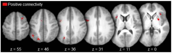 Regions with positive functional connectivity to MD included the bilateral lateral prefrontal cortex (right superior frontal sulcus and left precentral sulcus), left medial prefrontal cortex, left superior parietal cortex (intraparietal sulcus), bilateral insula, and the right putamen (Table 3 and Figure 5). There were no regions with negative functional connectivity to MD.