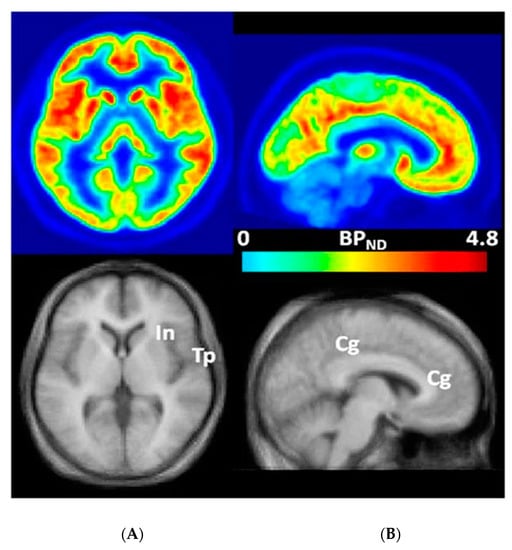 Transaxial (A) and sagittal (B) non-displaceable binding potential (BPND) [] images of [18F]FPEB (top) and matching magnetic resonance (MR) images (bottom) in statistical parametric mapping (SPM) [] standard space. Regions with high BPND values, namely insular (In), temporal (Tp), and cingulate (Cg) cortices, are indicated on co-registered MR images []. This research was originally published in JNM. Wong DF, Waterhouse R, Kuwabara H, Kim J, Brašić JR, Chamroonrat W, Stabins M, Holt DP, Dannals RF, Hamill TG, Mozley PD. 18F-FPEB, a PET radiopharmaceutical for quantifying metabotropic glutamate 5 receptors: a first-in-human study of radiochemical safety, biokinetics, and radiation dosimetry. J Nucl Med. 2013;54:388-396. © SNMMI [].