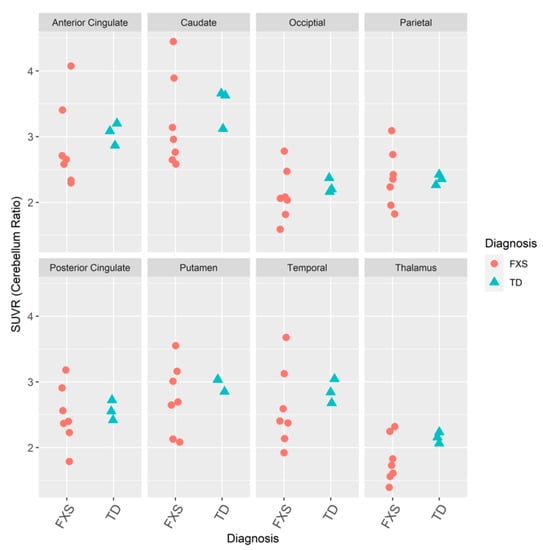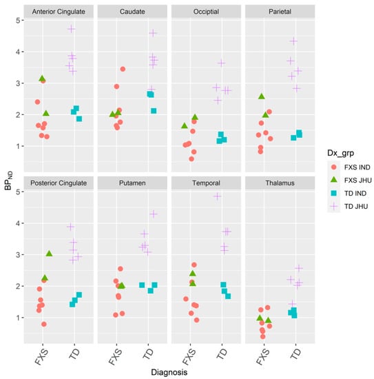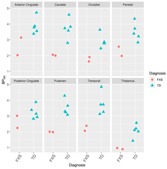 Dot plot of non-displaceable binding potential (BPND) [] images by reference tissue graphical analysis (RTGA) [,] of volumes of interest on positron emission tomography (PET) for 90 min of participants with FXS and ID (N = 2) and TD (N = 5) who received intravenous bolus injections of 185 MBqs (5 mCis) of [18F]FPEB [,,,].