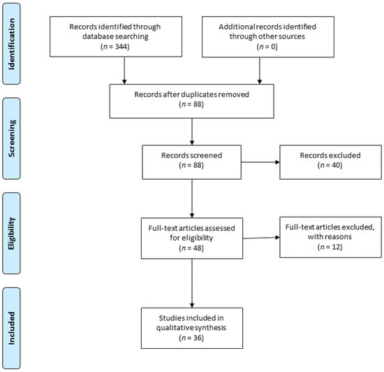 The search identified 344 studies. After applying the selection criteria, 36 publications were included in the analysis (Figure 1).