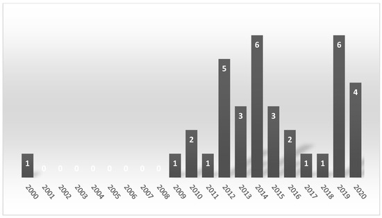 Thirty-six studies published between January 2000 and August 2020 met the inclusion criteria. The publication date indicated that during the first decade of the 21st century, the research on that topic was published only sporadically (Figure 2), but the number of publications increased in the second decade.