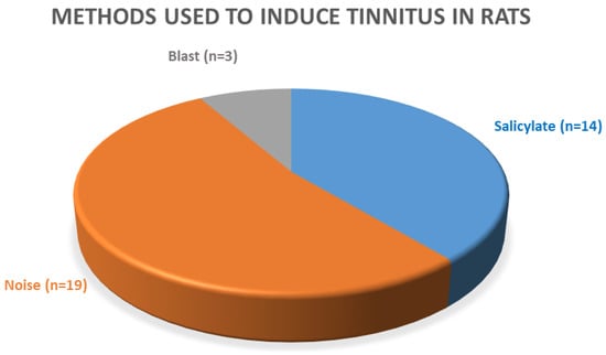 For the induction of tinnitus, three methods were used (Figure 3). In 14 articles, tinnitus was induced with salicylate [13,27,28,29,49,50,51,52,53,58,59,60,66]. Nineteen reports analyzed tinnitus after noise exposure [15,44,45,54,55,56,57,61,62,63,64,65,67,68,69,70,71] and three analyzed tinnitus after blast injury [46,47,48]. These publications were analyzed in one group because of the similarity in the blast- and noise-induced tinnitus mechanisms. They will be referred to as “noise-induced” throughout the rest of this review [75].