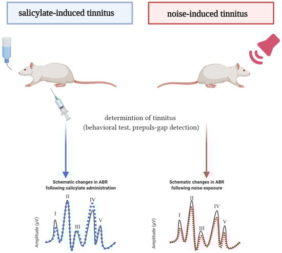 The present literature review attempted to extract and synthesize the knowledge about ABR assessment in rats with experimentally induced tinnitus (salicylate administration, noise, and blast exposures). The main goal was to determine whether there is a consistent impact of salicylate, noise, and blast-induced tinnitus on ABR features such as thresholds, latencies, and amplitudes. In addition, changes in the ABR profile of animals with tinnitus were scrutinized in the context of tinnitus-induction methods.