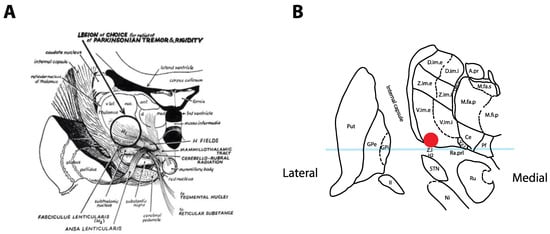 Together, these findings suggest that PSA DBS (including caudal Zi and Raprl targets) may provide at least equally effective tremor relief than Vim DBS with a similar side-effect profile and possibly more efficient stimulation parameters. A popular stimulation target in this area appears to be 1–2 mm inferior to the AC–PC plane, at the interface between the caudal Zi and Raprl (circle in Figure 2C) [24,51], where fibers in the PSA are the densest, before they progressively fan out as they reach the Vim and then project to cortical areas [16]. While stimulation of both targets likely affect the same network, the PSA’s proximity to the medial lemniscus and internal capsule makes it more vulnerable to off-target side-effects, and this may indeed factor into the observed lower energy parameters after programming is complete. This is less of an issue with DBS, where changes in programming (such as bipolar configurations) can usually resolve the problem [23], but it might explain why the Vim became the preferred target for lesioning (Figure 1) despite historical reports of significant PSA efficacy [52].