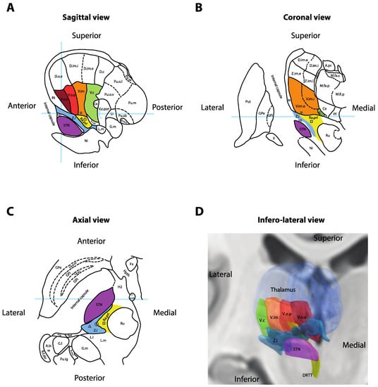 - Gallay, M.N.; Jeanmonod, D.; Liu, J.; Morel, A. Human pallidothalamic and cerebellothalamic tracts: Anatomical basis for functional stereotactic neurosurgery. Brain Struct. Funct. 2008, 212, 443–463. [Google Scholar] [CrossRef]