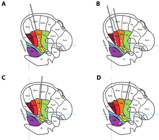 - Neudorfer, C.; Hinzke, M.; Hunsche, S.; Majdoub, F.E.; Lozano, A.; Maarouf, M. Combined Deep Brain Stimulation of Subthalamic Nucleus and Ventral Intermediate Thalamic Nucleus in Tremor-Dominant Parkinson’s Disease Using a Parietal Approach. Neuromodulation Technol. Neural. Interface 2019, 22, 493–502. [Google Scholar] [CrossRef] [PubMed]