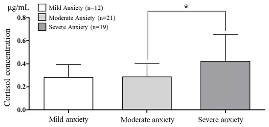 The comparison of cortisol concentration according to Beck Anxiety Inventory (BAI) anxiety. α = 0.05, * p = 0.011. df = 2, p = 0.011, et2 = 0.123, observed power = 0.784.