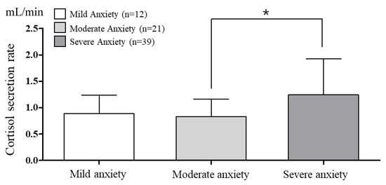 The cortisol concentrations and secretion rates according to BAI anxiety are presented in Figure 1 and Figure 2. The saliva flow rate was 3.02 ± 0.29 mL/min. One-way ANOVA revealed a significantly higher cortisol concentration in the severe anxiety group (p = 0.011). The cortisol secretion rate was also significantly higher in the severe anxiety group than in the moderate anxiety group (p = 0.014).