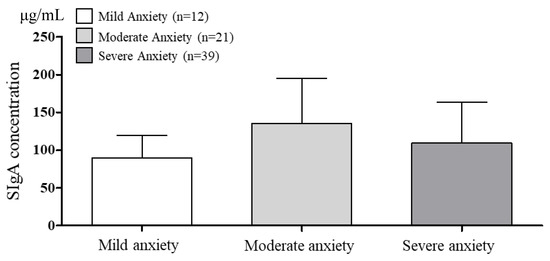 The comparison of SIgA concentration according to BAI anxiety. α = 0.05, p = 0.050 df = 2, p = 0.050 et2 = 0.083, observed power = 0.583.